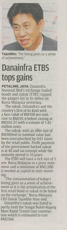 DANAINFRA Nasional Bhd's exchange traded bonds and sukuk (ETBS) closed at RM101.31 with a 1.31 per cent premium at its debut yesterday.