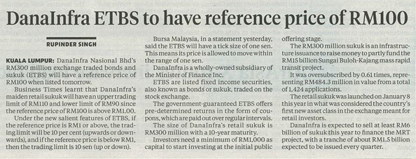 KUALA LUMPUR: DanaInfra Nasional Bhd's RM300 million exchange traded bonds and sukuk (ETBS) will have a reference price of RM100 when listed tomorrow.