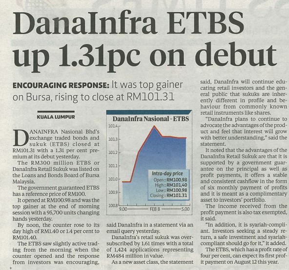 DANAINFRA Nasional Bhd's exchange traded bonds and sukuk (ETBS) closed at RM101.31 with a 1.31 per cent premium at its debut yesterday.