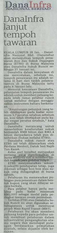KUALA LUMPUR 18 Jan. - DanaInfra Nasional Bhd. (DanaInfra) akan melanjutkan tempoh penawaran Bon dan Sukuk Dagangan Bursa (ETBS) di Bursa Malaysia atau DanaInfra Sukuk Runcit sehingga 25 Januari ini.