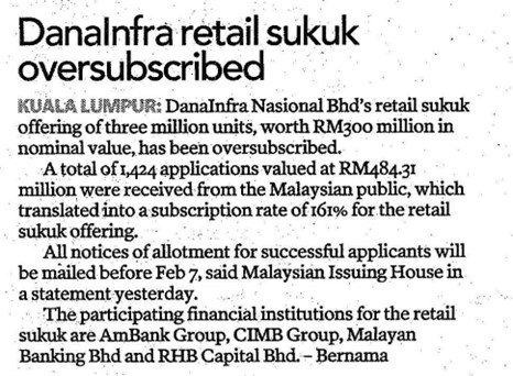 KUALA LUMPUR: DanaInfra Nasional Bhd’s retail sukuk offering of three million units, worth RM300 million in nominal value, has been oversubscribed.