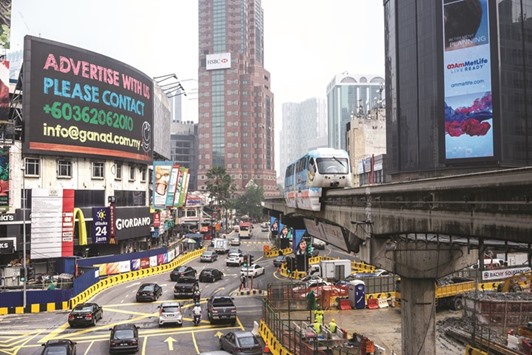 A monorail train travels along an elevated track as traffic passes a digital billboard in the Bukit Bintang area of Kuala Lumpur (file). Malaysia, which pioneered Islamic finance in the 1980s, is the world’s