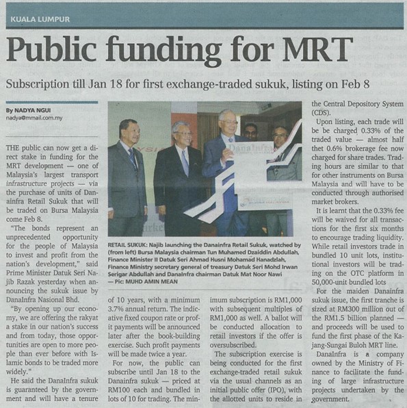 THE public can now get a direct stake in funding for the MRT development - one of Malaysia's largest transport infrastructure projects - via the purchase of units of DanaInfra Retail Sukuk that will be traded on Bursa Malaysia come Feb 8.