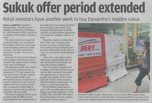 KUALA LUMPUR: DanaInfra Nasional Bhd, a wholly owned subsidiary of Minister of Finance, Inc, will extend the offer period for its maiden retail sukuk to another week.