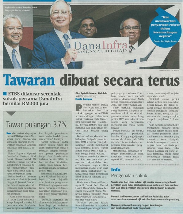 Perdana Menteri Datuk Seri Najib Razak melancarkan Bon dan sukuk dagangan bursa (ETBS) serentak dengan pelancaran sukuk pertama oleh DanaInfra Nasional Bhd (DanaInfra) bernilai RM300 juta yang pertama kali ditawarkan secara terus kepada orang awam.